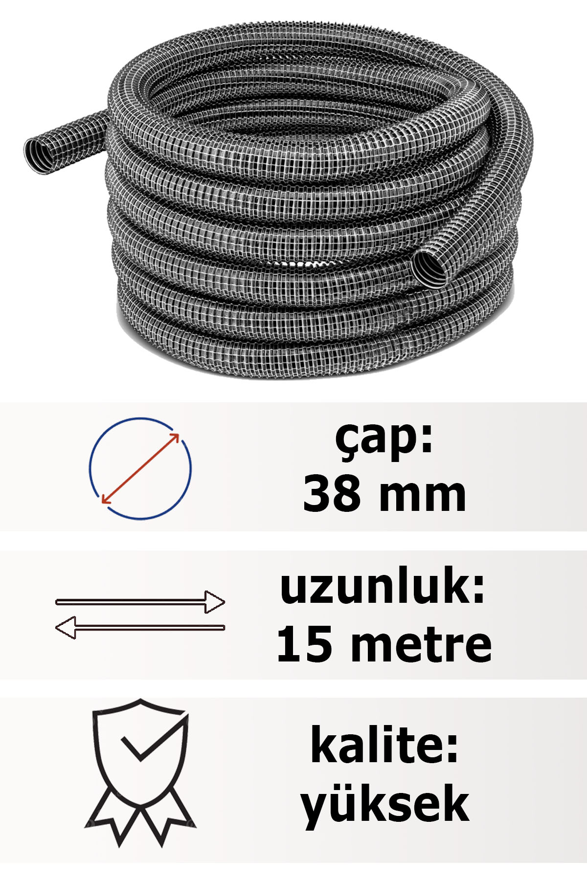 • 1 Adet Çelik Telli Süpürge Hortumu ( 15 Metre uzunluğunda ve 38 mm çapındadır )
